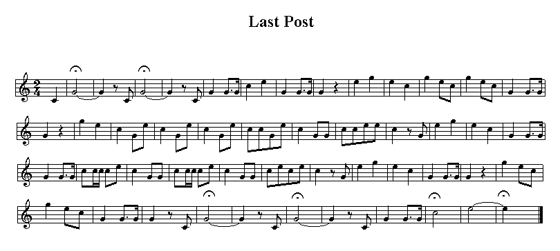 Neville Young's "The Last Post" MIDI file pageAlso includes Reveille or Rouse (please see note below about the name)New - Henry Allingham's funeral, 30th July 2009.There are great Last Post, Reveille and Rouse graphics in the "Bugle call" article on Wikipedia. If you need the parts I recommend you visit there.Here is the Last Post MIDI file (along with Reveille or rather Rouse). As far as I know they work OK but you may need to fiddle with them: this is not my area of expertise! I am now adding links to relevant pages - you'll find the starter link at the bottom of this page. Please don't use these files for anything naff or offensive. If you use any of my "The Last Post" or "Reveille/Rouse" files your own website or any other purpose, please give me a credit. "MIDI Bugle by Neville Young" would suffice, thanks. If you would rather not mess around with electronic versions then Boosey and Hawkes publish it as a nice laminated card. For all of 95p (i.e. not much money) you get the Last Post and Reveille in both Infantry and Cavalry versions. (The latter are completely different from the familiar ones.) That's about 24p a tune. B&H reference number 9177. Reveille (Rouse, really) available