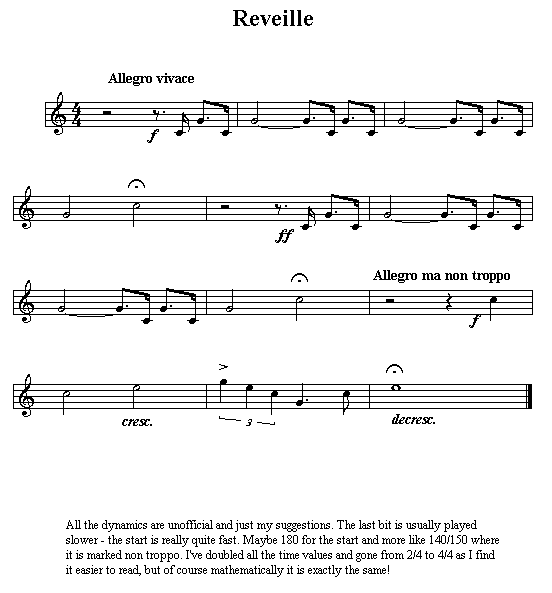 THE LAST POSTHere is the MIDI version: lastpost.mid (1K) ... and an MP3 one: lp.mp3 (almost 1 mb). Sadly it's still all the MIDI bugle rather than a live performance - but hey. and here is my Encore original: lastpost.enc (11.2K) and here is a Zip file with both of them in: lastpost.zip (2.4K). I hope that one of these works for you. If your browser tries to do annoying things when you click one - like play the MIDI file rather than save it - you may find that it helps to right-click the link and then choose something like 'Save Target As ...' but this is quite browser-dependent so you will probably have to sort it out for yourself. Finally, in case you haven't got Encore or any MIDI program or anything, here is a graphical version as a GIF file: Again, if you just click it your browser will probably just display it. You may need to right-click the link and choose some relevant option in order actually to download it. It's just a screendump from my Encore version so it's probably not brilliant, but marginally better than nothing, I hope. The other thing you should note is that there are some pauses: specifically, every note that is a minim (half note) or longer has a pause, that is, the first two long notes and the last four long notes in the piece. I couldn't persuade Encore to do these, so they just go flashing past at high speed! The metronome mark in my printed copy is 152 by the way. Oh and each of those long notes (see above) has a crescendo-decrescendo hairpin mark on it too. The MIDI version is performed in Bb and asks for voice 56 which is meant to be a GM trumpet. But if you notated it, you would notate it in C (like the Encore and Gif versions) and give it to the bugler to sort out. Don't write it out in Bb, they won't thank you! :) I hope this lot is some help to someone. If so please drop me an email to say so. If you have problems with the files do tell me but goodness only knows whether I will be able to help ... Finally, if you know of some copyright reason why I should not have done this, you'd better warn me! :) The Last Post is a bugle call used by the UK and Commonwealth armed forces. It is played at military funerals, Remembrance Day and Anzac Day ceremonies, and the like. I'm afraid that I don't know much about its history but if I ever find out more I'll add it here. US readers will probably be familiar with Taps: as I understand it, the two tunes are different, but the role they play is the same. REVEILLETo understand what these files are, you need to read through the stuff above about "The Last Post". I haven't repeated it all here. I'll give you the option of the files, then there are a couple of notes which may be interesting and useful. Or not ... Here is the MIDI file: rev.mid - please note this is NOT a beautiful performance - it is not fettled like "The Last Post" And here is the Encore file: rev.enc This is a zip with both in: rev.zip And this is just a .gif graphic of the score: rev.gif Finally here is a zip with all 3 filetypes in: revall3.zip About ReveilleThere are notes in the Encore and Gif versions which explain what I've done. Reveille is quite often but not always used almost as if it were "the other half" of The Last Post in Remembrance Day events. If it is used, the common pattern seems to be that The Last Post starts off the silence (one minute or two, seems to vary) and the flags (e.g. veterans' organizations like the British Legion) are lowered. After the silence you play the Reveille, up come the flags, and you're done. But please please do not quote me as gospel on this. Take your lead from the religious or military person presiding - it's their show. Only offer guidance if they are clueless, which is unlikely. Make sure you have agreed the procedure and jot it all down so you can have a note on your music stand during the service. Check who is timing the silence, and its length, and write this down too. Unless you have an officiating person right next to you, it's probably safer if you time it - just make sure you have a suitable watch etc (where you can easily look at it without it being obvious - otherwise it looks like you are worried about missing your train! - maybe on the music stand, not your wrist?) and don't forget to start timing! (But if you do, don't panic - just have a guess at it. No-one will know.) By the way, "Reveille" is one of those Franglicized words that now has an accepted UK English pronunciation. If you try to say it sounding French, people will raise their eyebrows and think you a mite pretentious. The standard English pronunciation is something like "ruhVALLey". The name - Reveille or Rouse???It's looking very much like I have been (for many years) the victim of a common confusion about the name of this piece. The piece dealt with here, it appears, is actually Rouse, although it is used as described. The real Reveille is a different tune, much longer, and not used for Remembrance Day (etc) events in the same way, though one source says it does get used for morning services only. My current thinking is that you can probably use the resources here in exactly the same way as proposed, but if you want to be correct you could quietly point out what the real name of the tune is: if someone asks you to do the "LP and Reveille" it is likely that they also have the same confusion, and are expecting to hear the two tunes on this page, whatever their name. But I am working on sorting it out a bit more and if/when I do feel that I know what I am doing I will revise the page accordingly, and explain what I have done. I will mention in rmmt and TPIN when the page is next revised. My thanks are due to Jason Lea for pointing this out, and to a number of Commonwealth Remembrance or military music sites for further information. I will provide links to such sites when I redo this page. By the way please don't confuse the situation further by mixing all this up with the US Reveille - a different tune completely! And the same goes for
